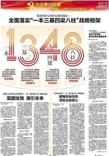 党代会报告提出,全面落实“一本三基四梁八柱”战略框架。对此,省第八次党代会代表、万宁市副市长侯晋封感到非常振奋,“这为全省各级党组织和广大党员干部把握发展方向、强化责任担当提供了重要方向和行动遵循。”