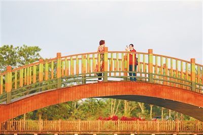 在屯昌县屯城镇文赞湿地公园,居民在桥上拍照留念。 方山 摄