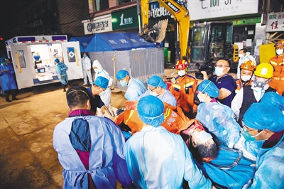 5月5日0时许,救援人员救出第10名被困者。 新华社记者 陈思汗 摄