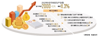 本报海口5月8日讯 (记者习霁鸿)5月8日,“奋进自贸港 建功新时代”——贯彻落实习近平总书记考察海南重要讲话精神和省第八次党代会精神系列专题新闻发布会海口专场举行。海南日报记者从会上获悉,过去五年,海口经济高质量发展实现新突破,2021年全市地区生产总值首次突破2000亿元,增速11.3%。海口重点园区实现跨越发展,高新区生物医药等产业聚能成链,医药产值占全省73.6%。江东新区营收突破2000亿元,综保区、复兴城产业园营收超过千亿元。重大项目加快建设,集中开工重点项目272个,位于海口西海岸的亚洲最大的国际免税城将于国庆节前开业。