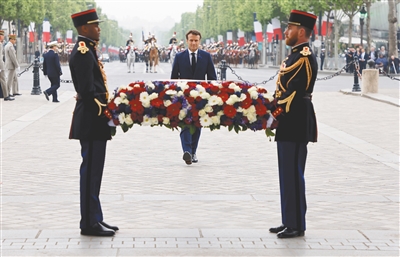 5月8日,法国总统马克龙(中)在巴黎向凯旋门下的无名烈士墓敬献花圈。