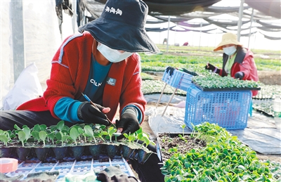 那受村村民周恩花在育苗基地务工,主要负责将青瓜苗嫁接到南瓜苗上。由她嫁接的青瓜苗,25天后将被送到各地的青瓜种植户手中。“在这里上班,能领到一份工资,还学会了嫁接这门技术,挺不错的。”她说。