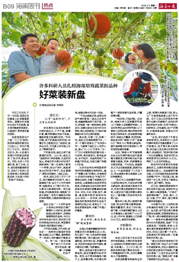 北京市农林科学院蔬菜研究所的李海真南瓜育种团队,基于“南繁北育”的模式,在海南用10多年时间培育出“中型贝贝”等南瓜品种,丰富了我国南瓜产品种类,让高端南瓜走进寻常百姓家;河南省驻马店市农科院专家每年在海南的南繁基地种植玉米、花生、大豆、芝麻、茄子、辣椒、番茄等作物的育种材料2000余份……多年来,来自全国各地的蔬菜育种团队往返于海南和内地之间,培育出了一大批优质蔬菜品种,丰富了中国人的餐桌。