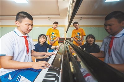 在海南(海口)特殊教育学校,甘运享(右一)和同学们一起享受钢琴弹奏带来的快乐。