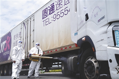 为进一步打通邮政快递业运行堵点,切实发挥好特殊时期邮政快递业保通保畅的积极作用,上海市5月8日发布了上海市邮政快递业第一批复工复产“白名单”企业,一共21家。图为5月9日,复工复产“白名单”企业之一圆通速递浦东集运中心工作人员对快递运输车辆进行消杀。