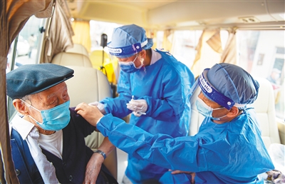 近日,医务人员在流动疫苗接种车里为北京市朝阳区老人接种新冠疫苗。新华社发