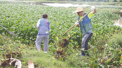 ■ 本报记者 叶媛媛微风轻拂,碧波荡漾……5月13日上午,在定安县定城镇南蛇沟,一派火热景象呈现在眼前。当天,定安多部门联合在此开展南蛇沟水浮莲清理行动。干部群众撸起袖子,挽起裤脚,扛起铁耙,个个干劲十足,一抡紧接着一抡,将耙尖砸向水中的一片片水浮莲。