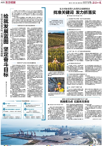 省第八次党代会报告多次提到“东方”元素。报告提出,今后5年主要目标,“三极一带一区”区域协调发展活力彰显,经济总量突破万亿元大关,力争在2021年基础上实现翻番。在今后5年重点任务中,提出打造“三极一带一区”区域协调发展新格局。