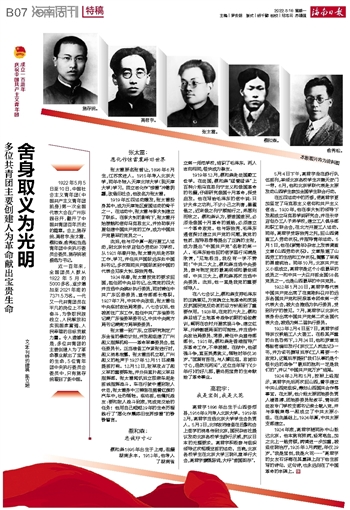文\本刊特约撰稿 陈立超1922年5月5日至10日,中国社会主义青年团(中国共产主义青年团前身)第一次全国代表大会在广州东园召开,翻开了中国共青团百年历史的篇章。会上,施存统、高君宇、张太雷、蔡和森、俞秀松当选青年团中央执行委员会委员,施存统被推选为书记。