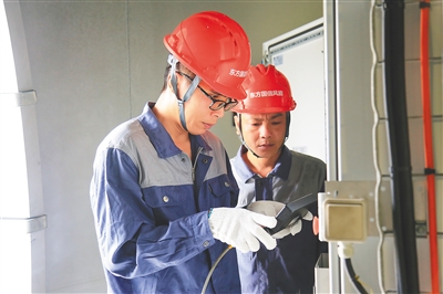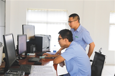 文承敬(右)在中控室监控风机运行情况。 海南日报记者 刘婧姝 摄