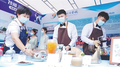 据了解,该活动以“技能:让生活更美好”为主题。当天,职校师生在现场共展示珠宝鉴定、网络直播、黎锦双面绣、中医药、推拿理疗、急救技能、插花艺术、3D打印、激光雕刻、美发化妆造型、美容护肤、美甲技艺、机器人应用、手工制茶、南药及药膳食品制作、花式点钞等24项技能。本报记者 张茂 摄