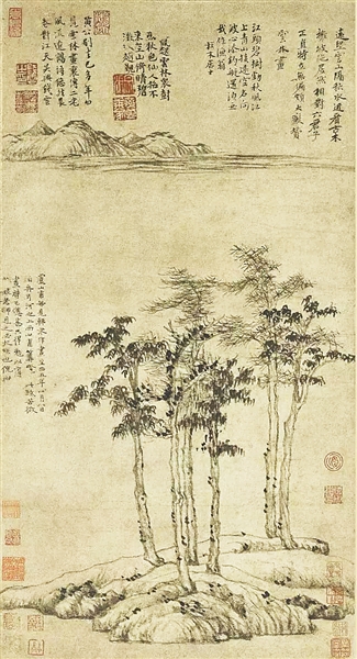 后人在画上还题有“江头碧树劲秋风,江上青山接远空”等句,甚富诗趣。《六君子图》现藏于上海博物馆。