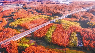 去年1月万洋高速旁的胶林红叶景观。特约记者 吴文生 摄