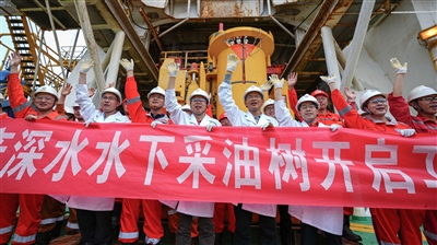 在“南海七号”钻井平台,我国首套国产化深水水下采油树设备首次安装,这标志我国深水油气开发关键技术装备研制迈出关键一步。图为工程师和工人一起挥手欢庆。