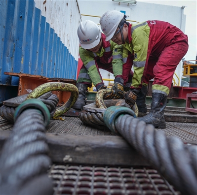 甲板班组人员正在挪动采油树吊装专用的钢丝绳,一条钢丝绳足足有一吨重,需要两个人才能挪动。