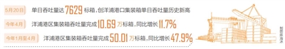 本报洋浦5月26日电 (记者林书喜 特约记者李灵军 通讯员符润彩)海南日报记者5月26日从洋浦交通运输和港航局获悉,今年以来,洋浦国际集装箱码头业务量逆势上扬,5月20日单日吞吐量达7629标箱,创洋浦港口集装箱单日吞吐量历史新高。据洋浦国际集装箱码头有限公司有关人员介绍,5月20日当天,码头8条作业线同时开工,“泛亚上海”“宝安城88”“众兴宏运”“惠金桥293”“海峡方舟”5艘集装箱货轮相继进港靠泊作业。其中,“泛亚上海”船时效率达到了226标箱每小时。