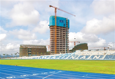 5月26日,陵水黎安国际教育创新试验区滨海永久校区的各项目正在加紧施工。该校区按照“大共享+小学院”模式,遵循“共享设施先行、配套服务同步”原则,突出“教科产城”融合发展理念,目前22万平方米基础设施已经封顶,龙光国际社区及商业配套、医院、中小学校、派出所等公共配套项目已经开工。见习记者 王程龙 摄
