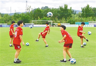 5月25日,在琼中女足训练中心,队员在认真训练。琼中黎族苗族自治县采取“中心+学校”合作模式,把遴选出的苗子集中在县内3所教育质量高的学校上课,成立10个足球班,配合训练时间制定专门的课程表。如果队员们外出比赛、集训,学校还会专门派老师随队补课,尽可能为队员们提供系统、完整的文化教育。见习记者 王程龙 摄