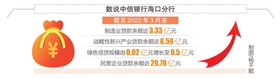 精准滴灌,支持国家重点区域大战略。在服务海南自由贸易港建设的进程中,中信海口分行充分发挥集团金融全牌照、实业全链条优势,倾力服务国家重大战略布局,持续深化对“一带一路”、海南自由贸易港等国家重大战略区域的金融支持力度,助力区域可持续高质量发展,助推国内大循环为主体、国内国际双循环相互促进的新发展格局。一是着眼大局,持续加大制造业信贷投放力度。多措并举确保制造业贷款整体规模稳步增长,支持先进制造业发展和传统制造业转型升级。截至2022年3月末,该行制造业贷款余额近3.33亿元,战略性新兴产业贷款余额近6.59亿元,向辖内多家高新技术企业及“专精特新”小巨人企业提供综合融资服务。二是聚焦双碳,加速绿色金融发展。该行秉承“绿水青山就是金山银山”的发展理念,强化业务发展绿色转型,积极支持绿色产业,不断提高绿色贷款规模和占比。持续加大对节能环保产业、清洁生产产业、清洁能源产业、生态环境产业、基础设施绿色升级、绿色服务等6大绿色产业的信贷投入。截至2022年3月末,该行绿色信贷短期内实现较大突破,两年内绿色信贷规模由0.02亿元增长至9.5亿元。三是坚守初心,与民营企业共成长。该行上下全力推动金融服务民营企业工作,助力民营经济发展行稳致远。截至2022年3月末,该行民营企业贷款余额近29.79亿元。