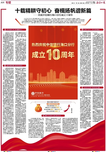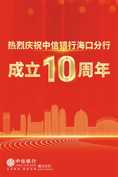 十年栉风沐雨,笃定前行。中信银行海口分行主动融入海南经济社会发展大局,始终与海南的发展同呼吸、共成长,不断提升精准服务实体经济质效,在支持实体经济中成长,在深化变革中创新,在高质量发展中腾飞,以实际行动践行国有企业的责任担当。