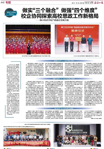 2022年2月,教育部思政司公布了第三批新时代高校党建“双创”遴选结果,海口经济学院(以下简称海经院)雅和人居工程学院学生党支部入选“全国党建工作样板支部”,全省仅3个项目入选;去年,学校学生思政工作案例荣获“全国民办高校学生工作创新成果奖”一等奖、合唱作品《撒里啰》获全国大学生艺术展演一等奖、学校“三下乡”社会实践队获“全国社会实践活动优秀团队”(全省仅4支实践队获奖)、学校马克思主义学院教师获得全国教育科学“十三五”规划课题1项、国家社科基金项目1项……近年来,海经院思政工作成果不断,得益于该校始终坚持德育为先,守正创新,主动对接行业龙头企业,成功探索出了一条对标海南自贸港建设重点领域,建设产业学院的应用型人才培养特色发展之路。在产业学院建设过程中,该校的思政教育同步并行,充分发挥合作企业优势,共同推动校企协同育人,逐步构建并形成了应用型本科高校“三个融合”“四个维度”的思政工作新格局。