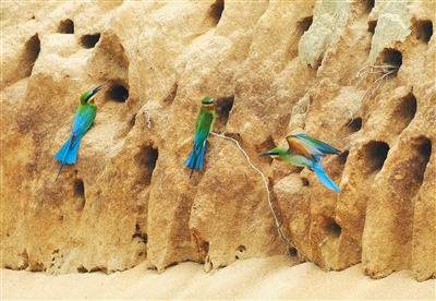 “这是蜂虎用锋利的嘴和爪子在陡峭的崖壁上建起来的家,这些近一米深的洞穴可以保证巢穴的温度恒定,便于其在气温急剧变化的情况下,孵化和养育幼雏。”畓榃湿地研究所所长卢刚引领探访团按工作人员规划路径,既不干涉蜂虎的日常栖息生活,也可以更好地了解蜂虎生活习性。据他介绍,目前,是蜂虎返回海口五源河筑巢繁殖的季节,雌性蜂虎正在洞穴里孵化宝宝,雄性蜂虎则外出觅食,因此这会儿肉眼可见到的蜂虎并不多。