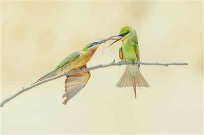 栗喉蜂虎接受同伴“投喂”。 麦笃彬 摄