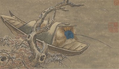 这画绘芦汀草岸,画面正中绘一船停泊,画中文士从乌篷中探头而出,旁侧仆童侍立,船夫摇桨停靠岸边。画中心的小船,应是一艘书画船。从船中乌篷小窗中,隐约可见一案几、一茶壶、几册书,几丛盆菊,表明这是个典型文人休闲娱乐空间。