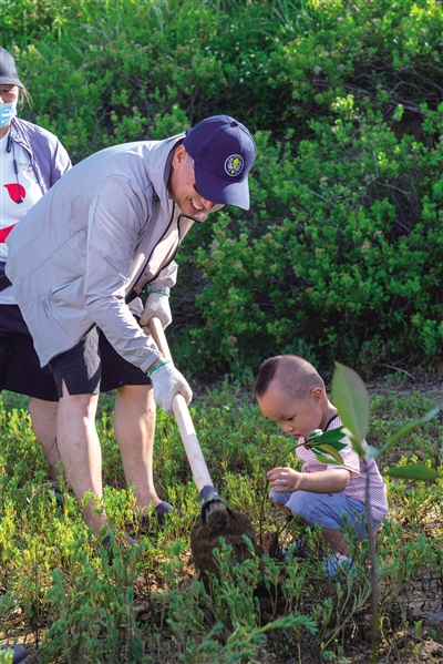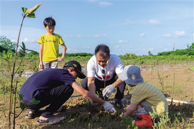 仪式结束后,海口东寨港保护区的工作人员向志愿者们介绍海南红树林湿地公园的情况,了解红树林的功能价值。在参观完红树林湿地科普馆后,志愿者们立即投入到植树活动中。志愿者分工协作,干劲十足,经过众人的辛勤劳作,一株株树苗在海滩上迎风摇曳。现场一派热火朝天的劳动场景,大家用实际行动为红树林保护种植和海南生态环境建设贡献一份力量。当天种植的树种主要有秋茄、红树等树苗。