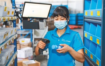 6月1日,在海口综合保税区海南菜鸟智慧中心仓,来自澄迈的拣货员罗小菱根据客户订单分拣商品。