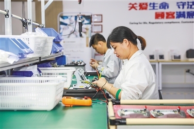 6月1日,在海口综合保税区的海南复星博毅雅医疗技术有限公司,工人在组装呼吸机。