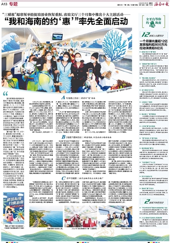 “在围绕活动主题推出线上线下营销推广活动的同时,我们通过联合航空公司、机场、港口以及金融企业、免税集团等开展多行业的联合推广,让活动覆盖面更广,营销更精准。”省旅文厅负责人表示,希望能够联动更多行业、企业,共同做好海南旅游营销推广。