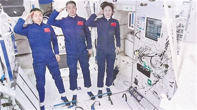 进驻天和核心舱的航天员陈冬(中)、刘洋(右)、蔡旭哲向全国人民敬礼。