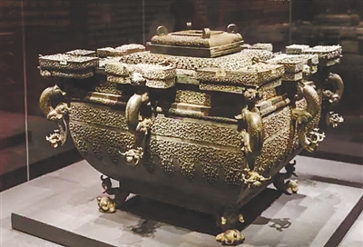 “曾侯乙铜冰鉴”又称“曾侯乙铜鉴缶”,于1978年在湖北随州擂鼓墩战国早期1号墓出土,同时出土两件,造型、纹饰、大小均同。此器结构复杂,造型奇特,工艺精湛,是一件具有特殊用途的大型酒具。它由内外两件器物构成:外部为鉴,鉴内置一尊缶。鉴与尊缶之间有较大空隙,夏天放入冰块,冬天则贮存温水,厚实的青铜外壁能够隔热保温,尊缶内盛酒,这样就可以喝到“冬暖夏凉”的酒,被誉为我国最早的“冰箱”。