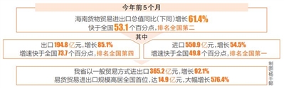 本报讯(记者周晓梦 通讯员林柏荣)今年前5月,我省货物贸易进出口总值745.7亿元。海口海关近日公布的统计数据显示,今年前5个月,海南货物贸易进出口总值同比(下同)增长61.4%,快于全国53.1个百分点,排名全国第二。其中,出口194.8亿元,增长85.1%,增速快于全国73.7个百分点,排名全国第四;进口550.9亿元,增长54.5%,增速快于全国49.8个百分点,排名全国第一。