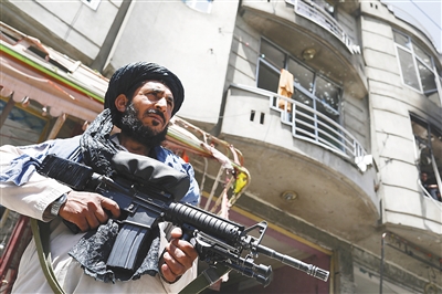 6月18日,塔利班武装人员在喀布尔寺庙袭击现场执勤。新华社/路透