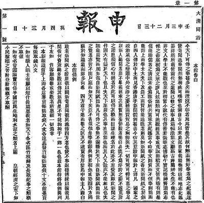今年是上海《申报》创刊150周年,作为近代中国历史最悠久、影响最深远的一份中文报纸,《申报》素有“中国近代史上的百科全书”之称。从1872年创刊至1949年终刊,在近80年的岁月里,《申报》对近代中国政治、经济、文化等诸多领域进行了持续、广泛和全面报道,记录了那个时期中国社会的方方面面,为后人了解、研究近代中国社会风貌提供了诸多细节——当然,由于时代和思想的局限性,这些历史细节也存在着某些偏差和误读,这也是后人和研究者应该注意的问题。1872年4月,《申报》在上海创刊,创办人叫美查,是一位在沪经营茶叶和布匹生意的英国商人。美查长期在上海经商,对中国历史、语言和文化都非常熟悉,由此产生了办一份中文报纸的想法。他和几位朋友合伙出资,以1600两白银创办了报纸。因为报纸在上海创办,故命名为《申江新报》,简称《申报》。