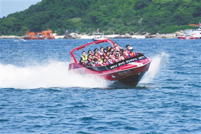 6月22日,游客在三亚蜈支洲岛旅游区体验动感飞艇。 本组图片均由本报记者 武威 摄