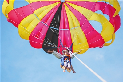 6月22日,游客在三亚蜈支洲岛旅游区体验彩虹拖伞。