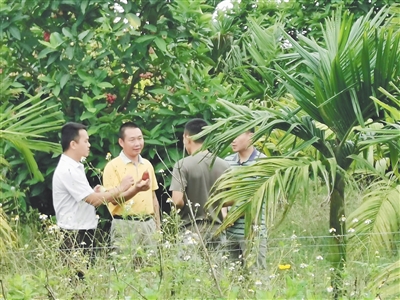 驻琼海社区戒毒(康复)工作指导中心民警(左二)走访帮扶社区康复人员蔡某的果园。