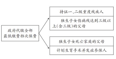 如果是持证一、二级重度残疾人、独生子女伤病残达到三级以上(含三级)的父母、独生子女死亡家庭的父母、计划生育手术并发症等参保人员,政府按照最低缴费档次为其代缴全部保费。