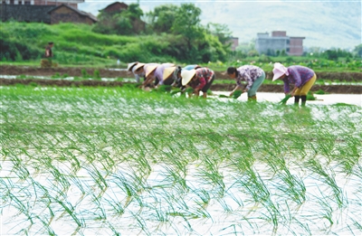 日前,在湖南省衡阳市耒阳市仁义镇十里村,当地村民抢抓农时种中稻。 新华社发