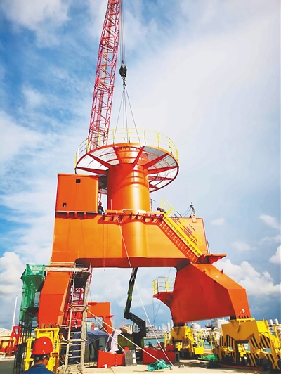 图①近日,在乙烯项目配套码头4号泊位,工人在吊装门机圆筒体。