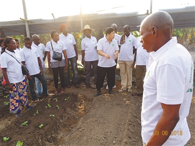 党选民(右三)在中国援刚果(布)农业技术示范中心开展蔬菜生产技术培训。