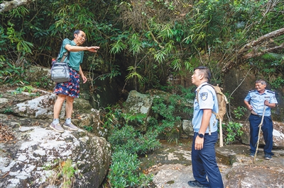 卓仲英(中)劝导游客不要进入尖峰岭核心区。