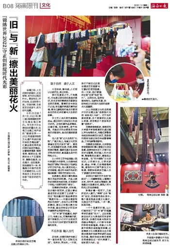 一个个场景的打造,让人们感受到了“旧”与“新”的碰撞带来的美丽“花火”。正如受邀参加此次文化周活动的专家学者所言,非遗的传承与现实生活融合得越好,人们参与传承的积极性就越高,传承人从传承中获得收益就越有保障;这场锦绣文化主题展览也会为海南非遗保护传承带来新的启迪和灵感,推动传统非遗在海南自贸港建设这一时代背景下,绽放更大光彩。