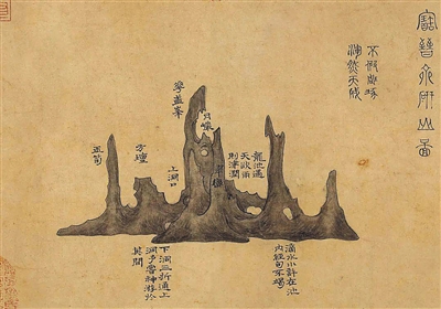 《研山铭卷》中的宝晋斋研山图,以细笔勾勒,皴染细腻,非米芾笔性,为“老仿”(后人仿前朝的作品)无疑。此图与陶宗仪《南村辍耕录》中的图例相契,有互为传抄的可能。该画展示了砚山的大致面貌,图中标方坛处即墨池。古代美学中始终有道法自然、宁拙勿巧的审美取向。而玩石之趣亦是如此,追求“不加雕琢,浑然天成”。
