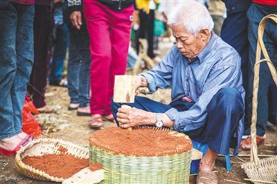 细微之处见真章,谷磨制作起来颇多讲究。“选用质量好的红粘土掺和盐拌匀后作为磨心。”黎显清老人告诉记者,就拿红土来说,不是当地所有的红土都能用,最好选择砂质土地里的土,黏性合适。而且,从田里拉回来的泥土必须用筛子仔细筛过,磨心磨盘原料用的是没有杂质的细土。同时,盐要用峨蔓镇等地晒制的海盐。土和盐的比例也很要紧,比例失调难成好磨。