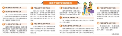 如“走进课堂”西沙研学之旅,带领游客走进课本上的西沙群岛,聆听海上丝绸之路历史故事,感受西沙原生态之美;“徜徉天地”探秘研学之旅,游览路线包含海口火山口公园、文昌航天科普中心等,使游客在3天2晚的行程中,既可探秘航天科技,又能了解南海文化;“黎乡寻踪”民俗研学之旅,将带游客重走五指山革命根据地纪念园、白沙起义第一枪纪念园等红色路线,游览五指山黎峒文化园、海南省民族博物馆等民俗文化场馆,在牙胡梯田、五里路有机茶园等地感受海南中部自然风光。