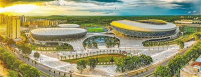 近日,航拍儋州市体育中心“一场两馆”。据悉,儋州市体育中心“一场两馆”是海南省第六届运动会的主场馆,也是举办开闭幕式的场馆,目前各项工作准备就绪,以“高颜值”迎接海南省第六届运动会的到来。本报记者 陈元才 摄